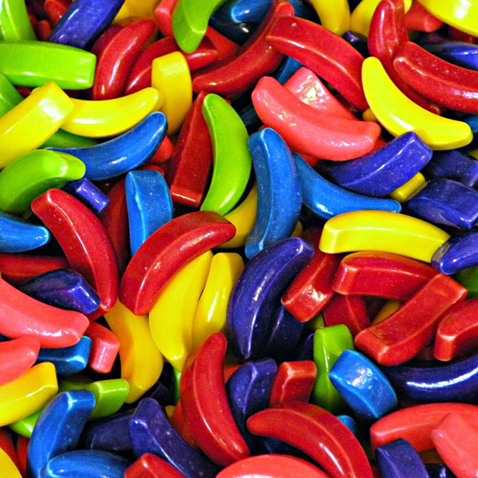 Crazy Bananas Candy - Kids love the bright colors of the banana shaped sweet-tart candies that kids of all ages love! Each piece is about 0.75" long. Sold by the case. Vends from any standard candy vending machine.